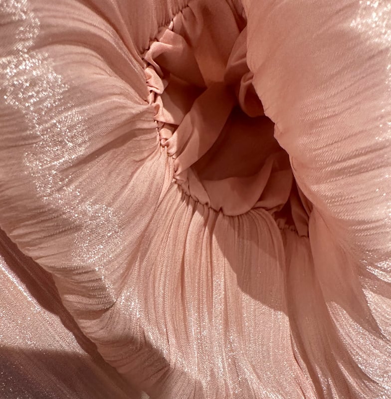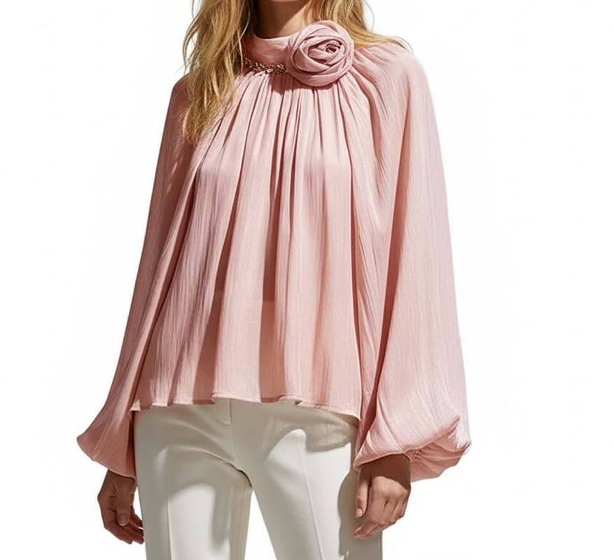 メタリックシフォン/スタンドカラー/ビジュートリム/コサージュ/バルーンスリーブ/フレアシルエット/ボウタイ
