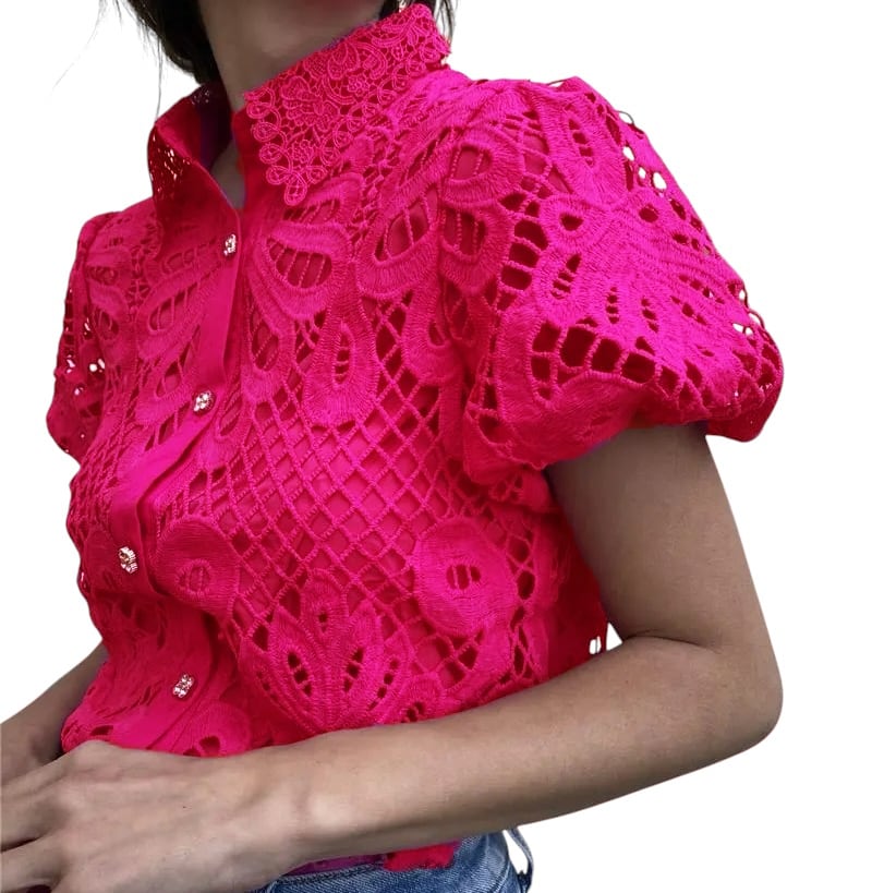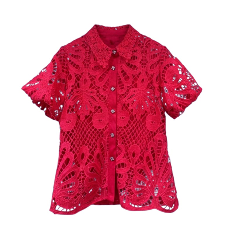 カットアウト/レース/パフスリーブ/ビジューボタン/レースカラー/裏地あり
