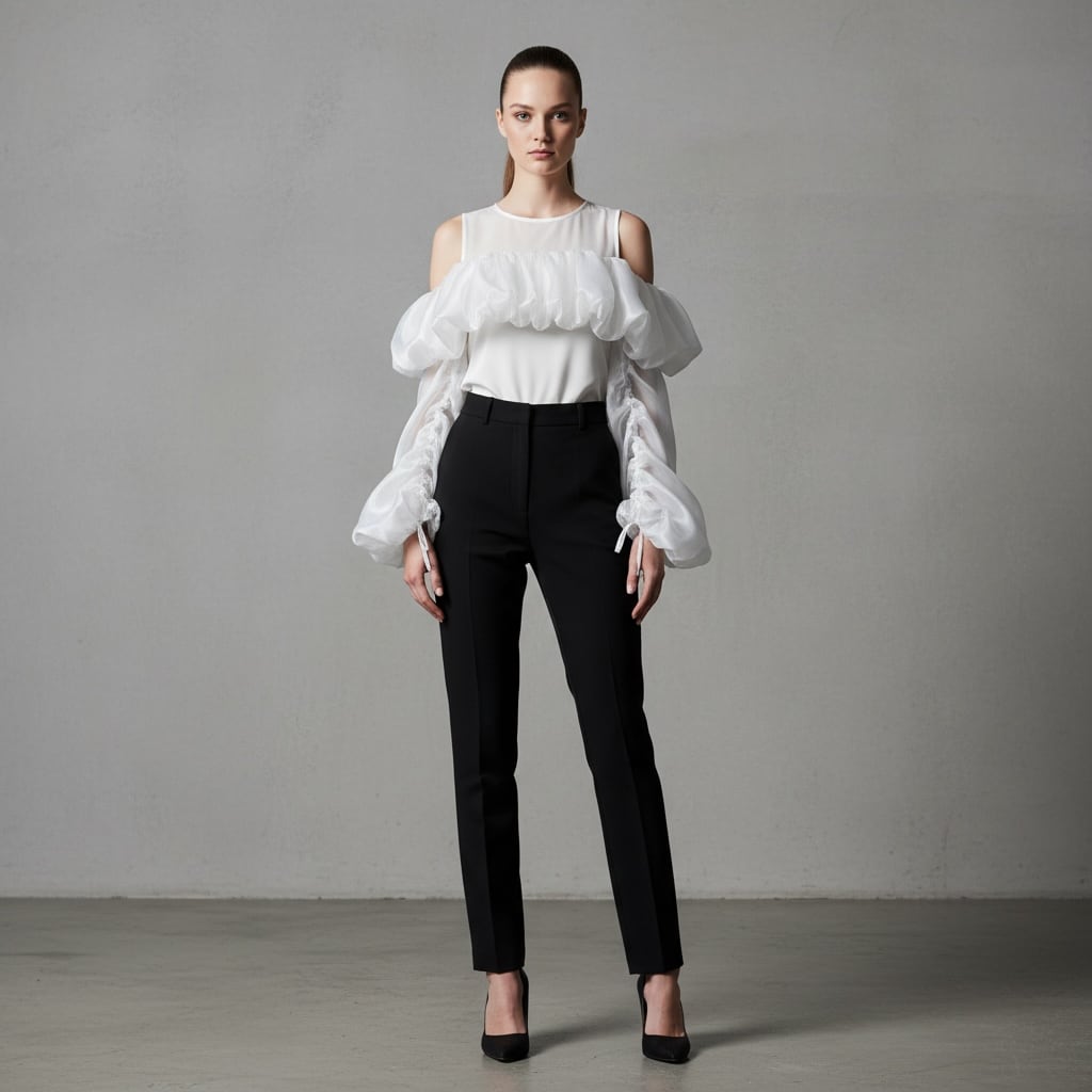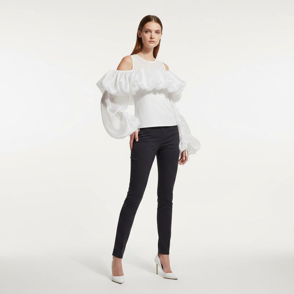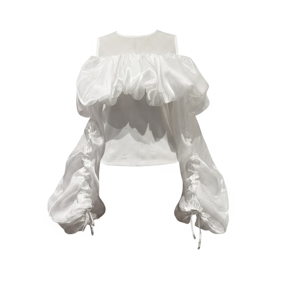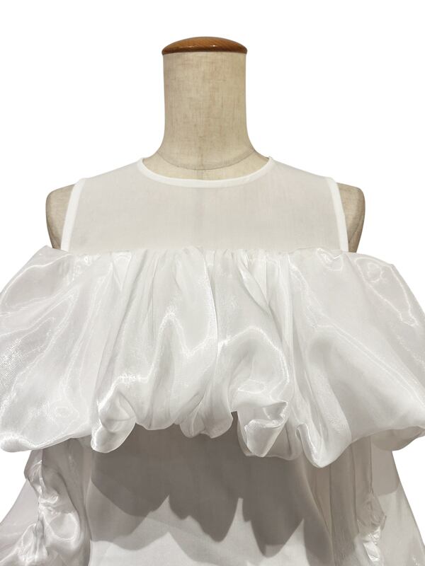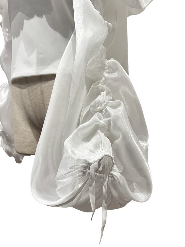 ■ディテール メッシュ/ストレッチ/オープンショルダー/プルオーバー/メタリックサテン/ボリュームスリーブ/袖ドローストリングス/