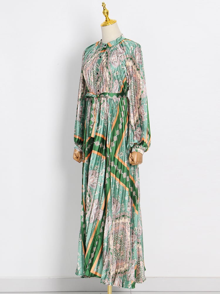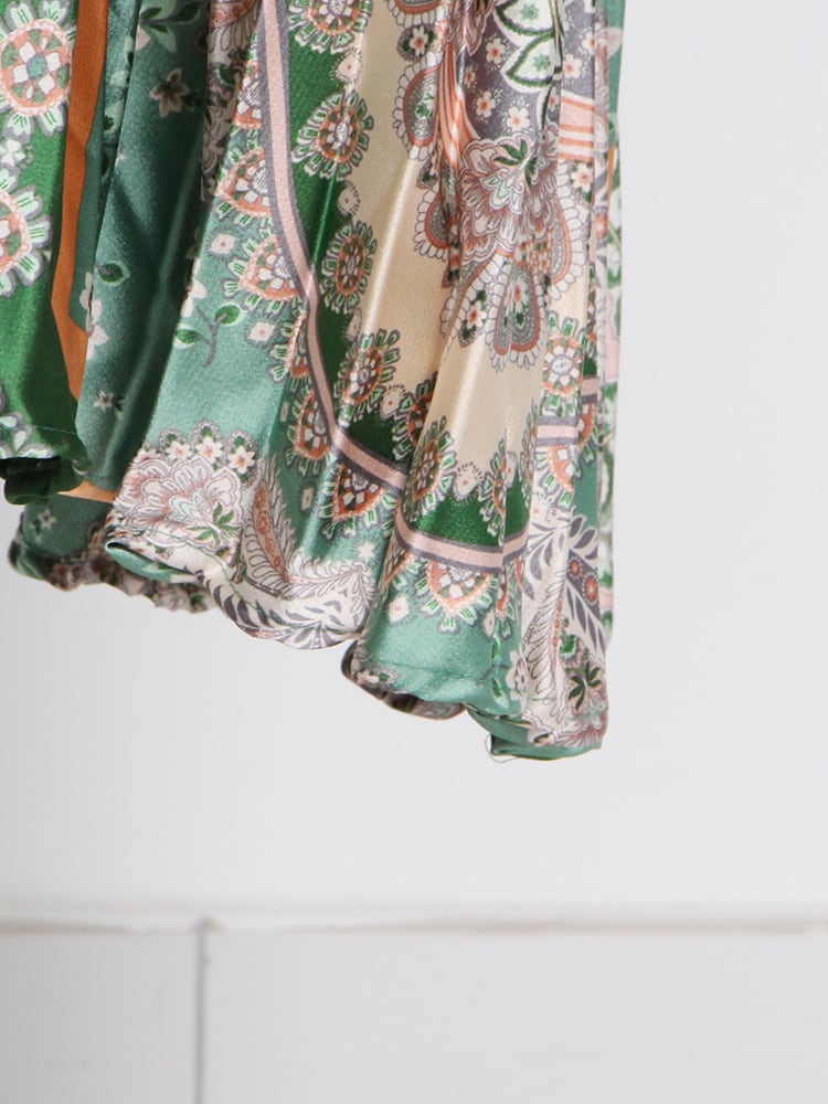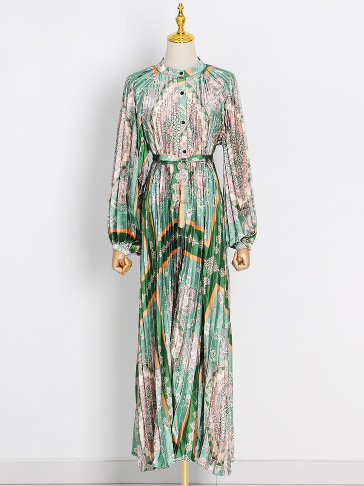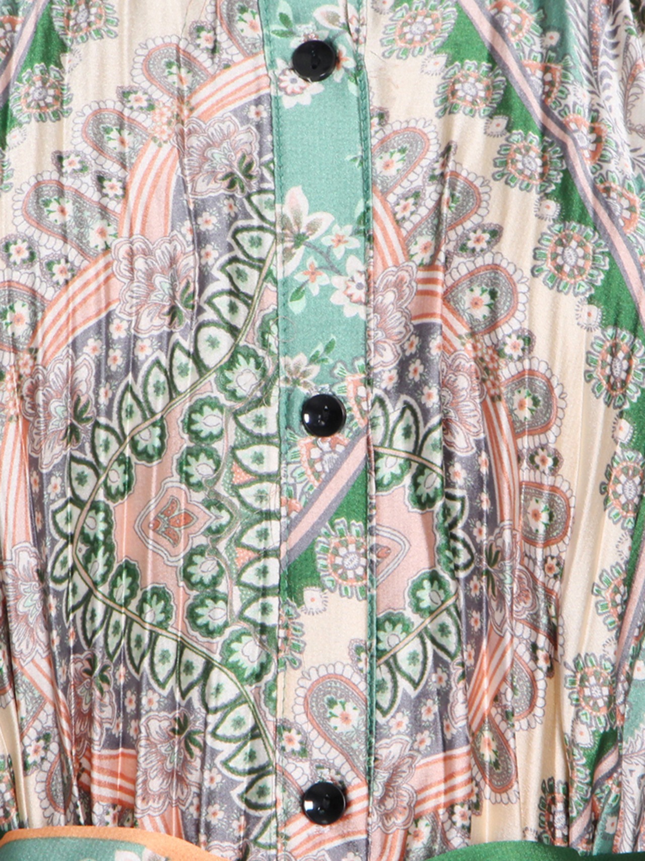 ■ディテール プリント/マンダリンカラー/バルーンスリーブ/サテン/プリーツ/フレアシルエット/裏地無し