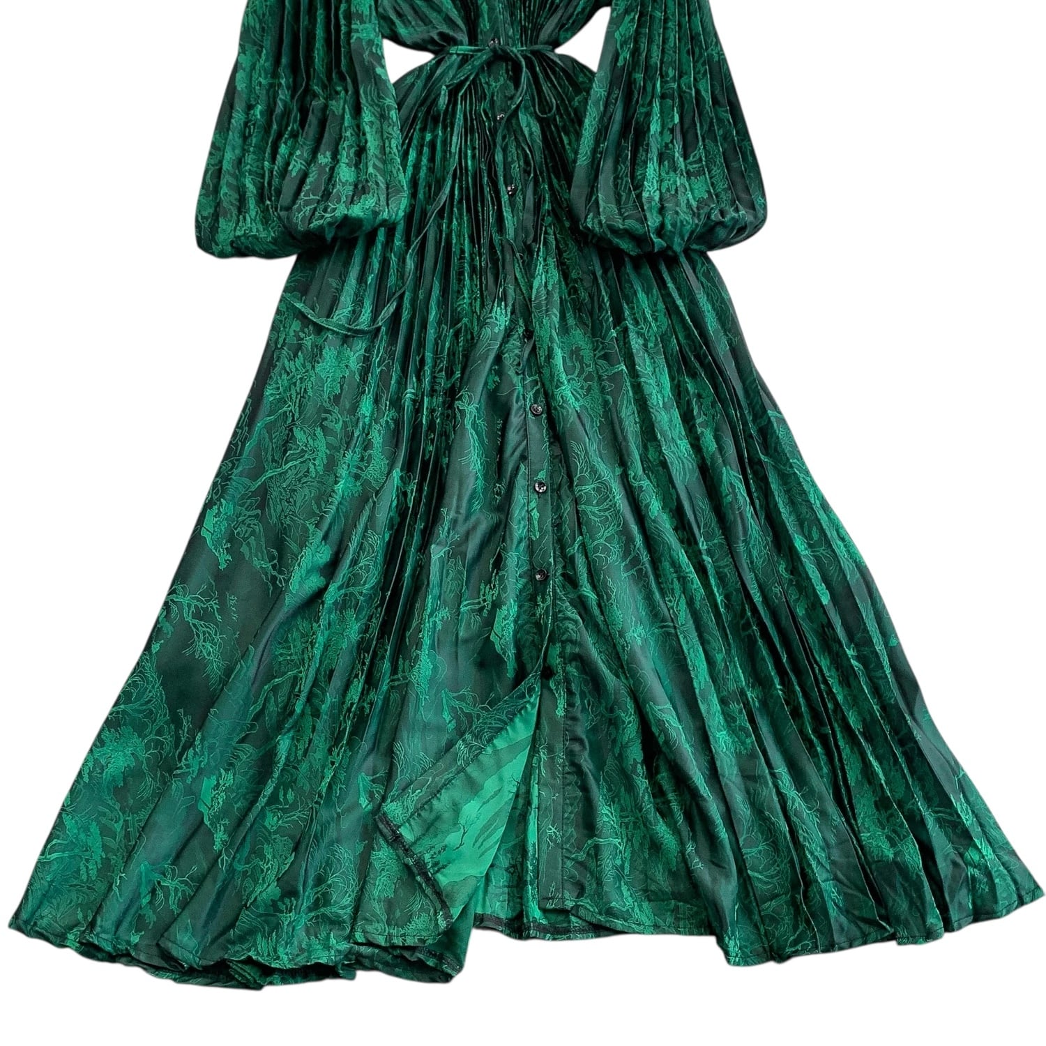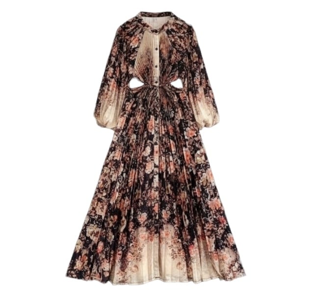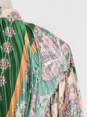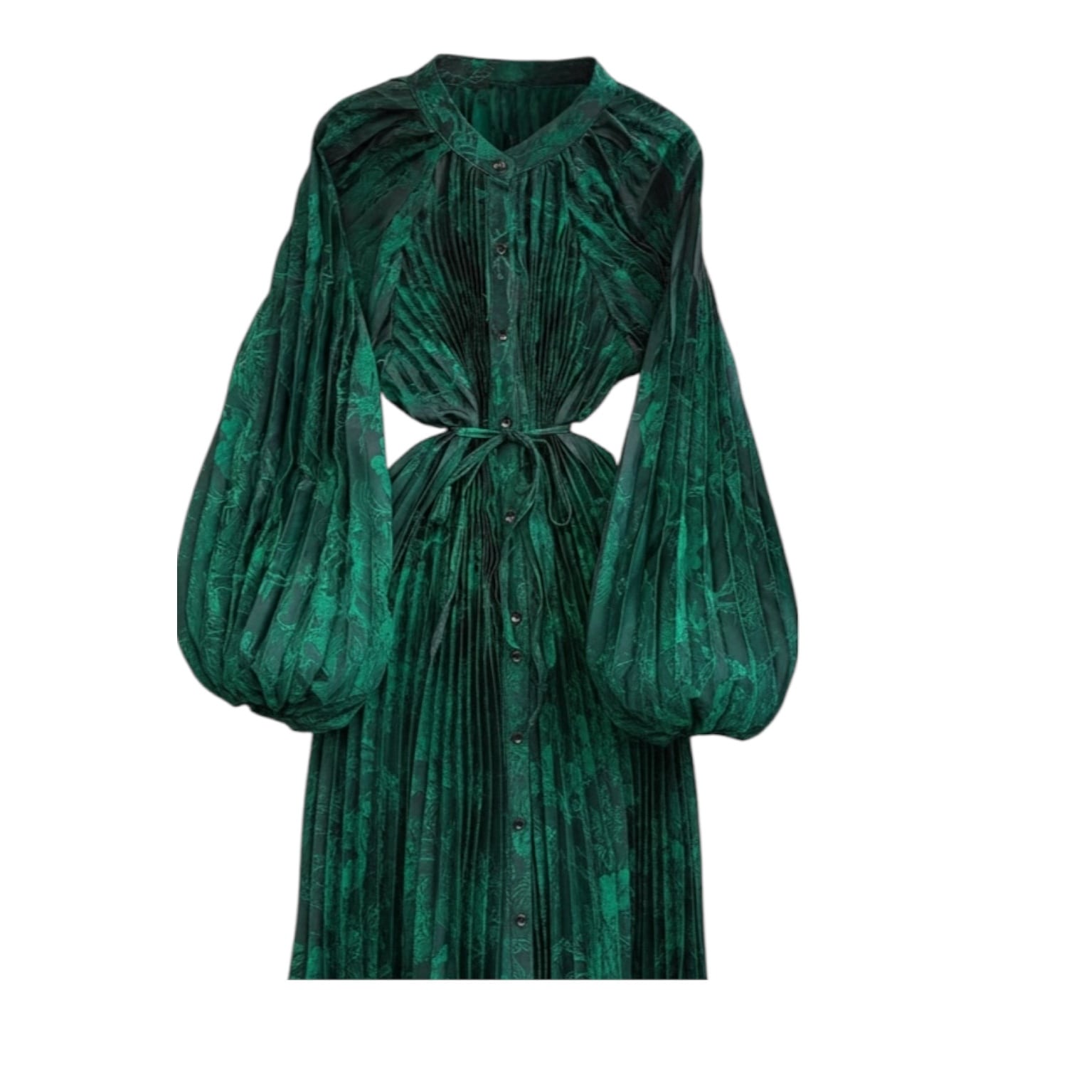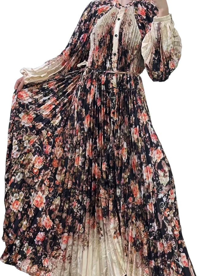 ■ディテール プリント/マンダリンカラー/バルーンスリーブ/サテン/プリーツ/フレアシルエット/裏地無し