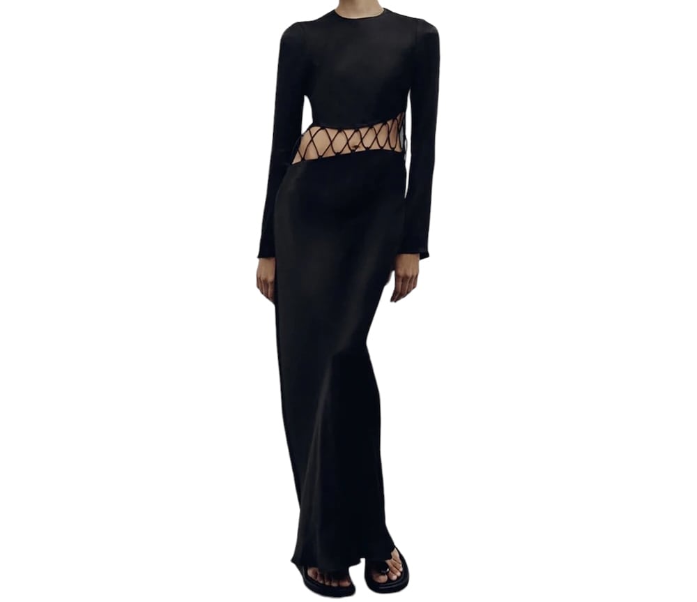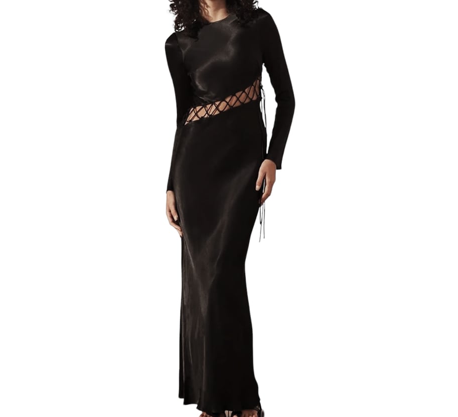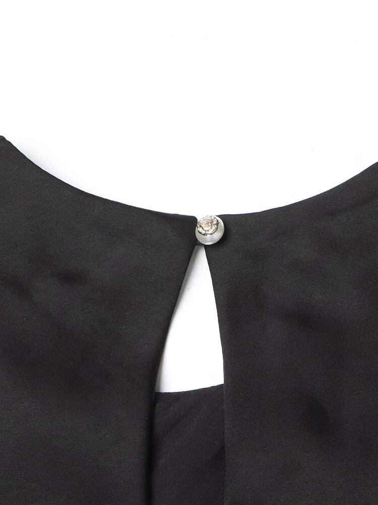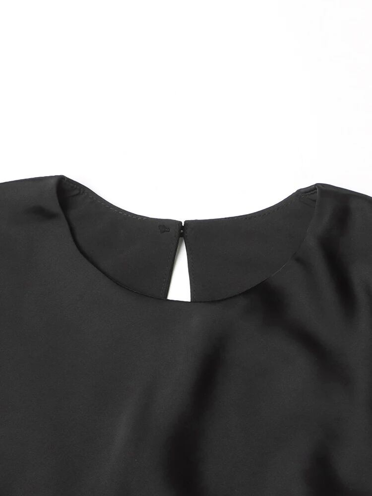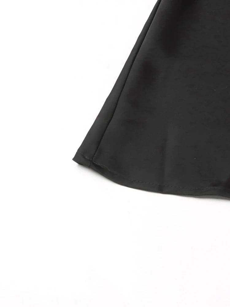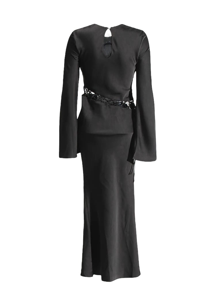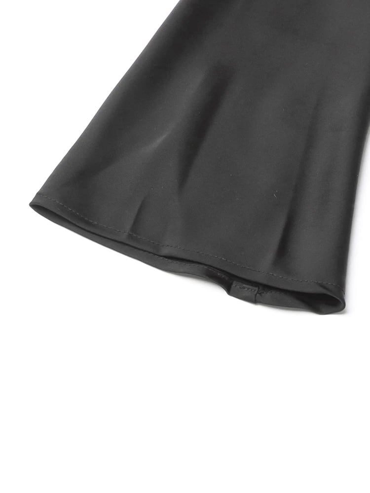 ■ディテール ブラックドレス/サテン/ウエストレースアップ/クルーネック/プルオーバー/ストレッチ/裏地あり