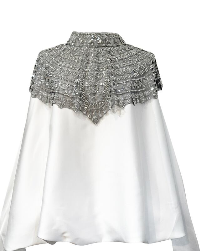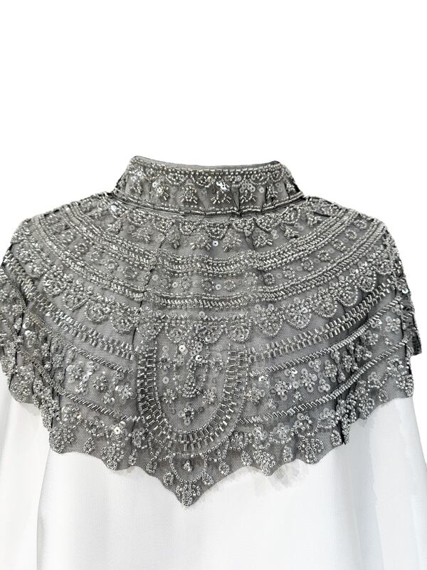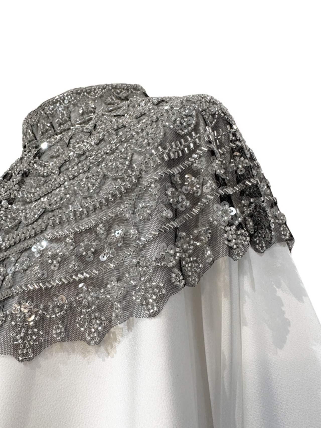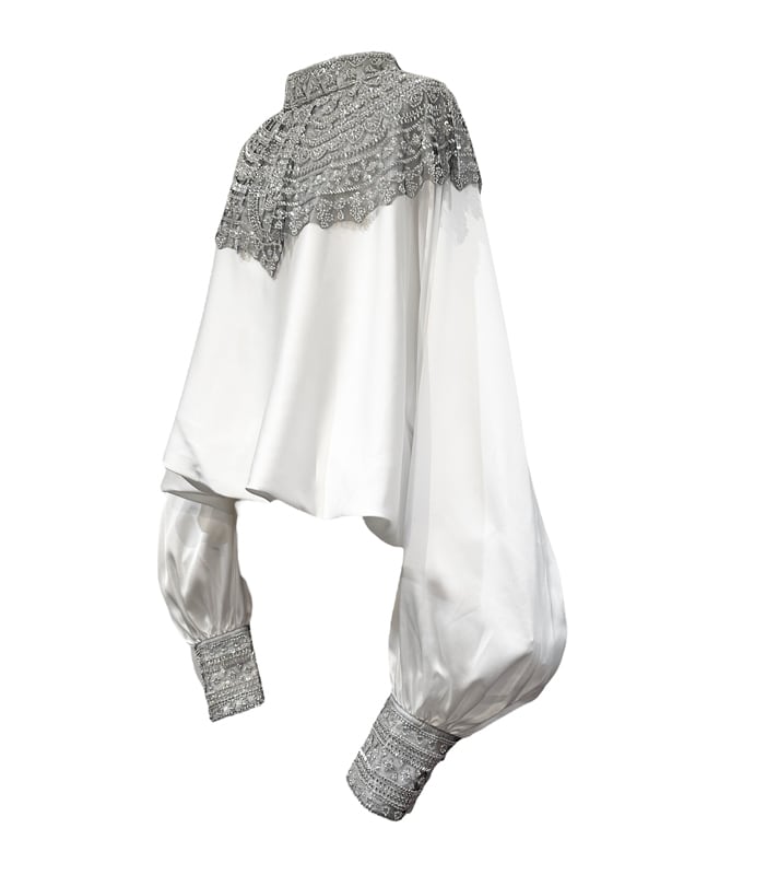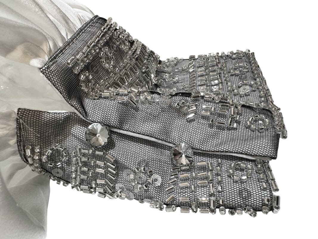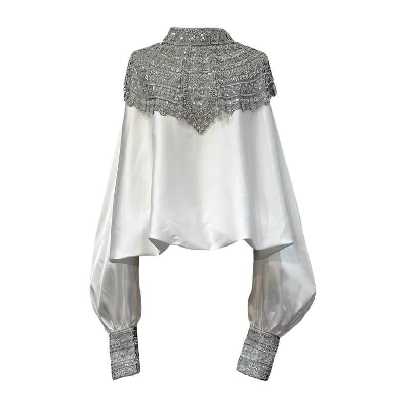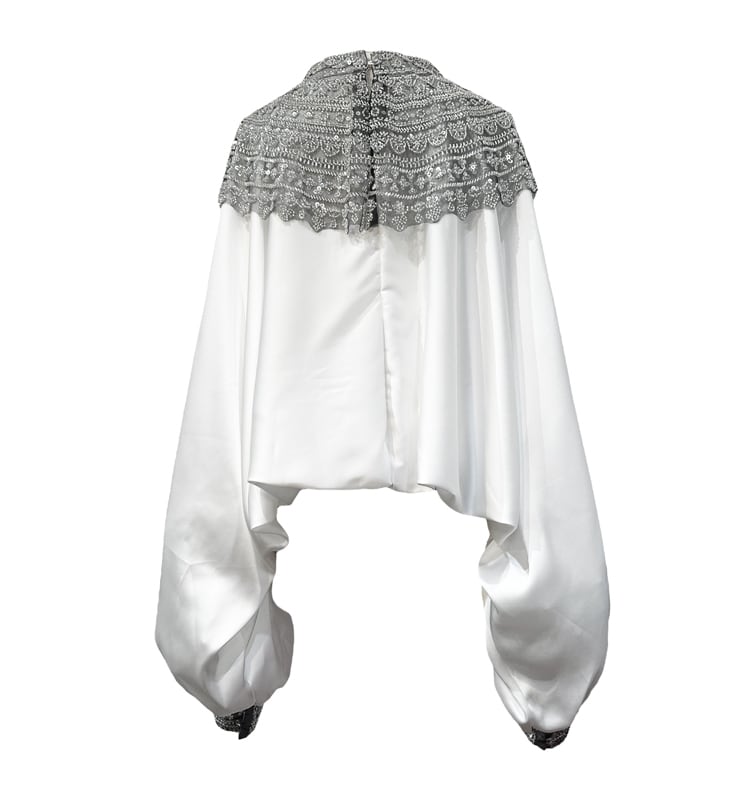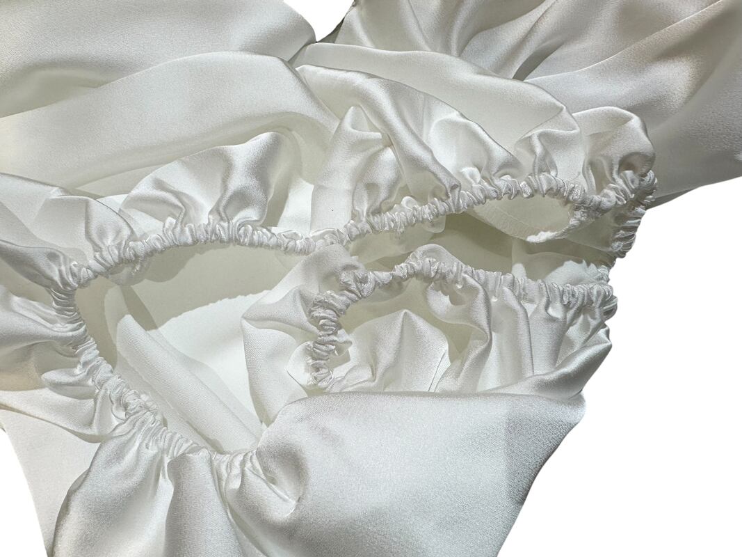■ディテール 厚手サテン/ビーズ装飾/ドルマンスリーブ/ボリュームスリーブ/ビジューボタン/ウエストゴムのギャザー